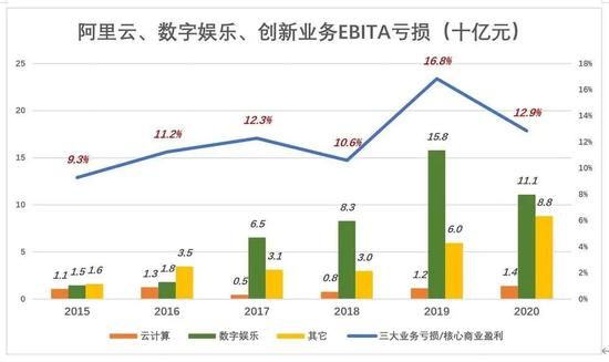 尽管云计算、数字娱乐、创新都在烧钱,但2020财年三大业务亏损额合计仅为核心电商EBITA的12.9%,比2019财年低3.9个百分点。