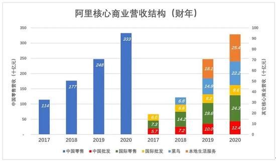 中国批发、国际批发是阿里的传统业务,2020财年营收分别为124亿和96亿,合计占核心商业收入的5%。