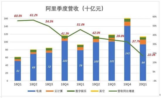 2020财年前三季度,营收同比增速大致保持在40%一线,第四季度增速突降至22.3%。其中:核心商业营收938.7亿,同比增长19%;云计算营收122.2亿,同比增长58.1%;数字娱乐营收59.4亿,同比增长4.8%。