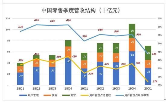 阿里用户管理收入的主体是广告收入,而且规模惊人。2020年Q1收入309亿,占中国零售收入的44%,占集团核心商业收入的33%。