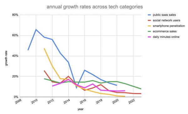 VC募资额的指数级增长、创业公司的发展,以及过去20年的对创业公司估值方法,都是假设这些互联网的风潮将在2020年代持续下去。很多公司的估值都是来自于未来12个月收入的预期增长,而这些增长假设了市场会持续性指数级扩张。但是,如果你看一下今天的这些假设,就会看到一个更黯淡的景象:它们不是指数函数,而是增速趋于平缓。