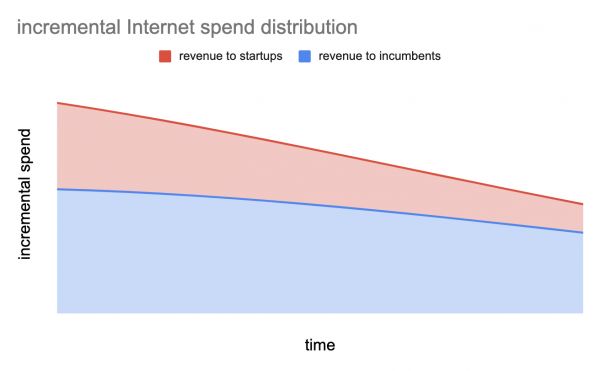 互联网风潮的减弱意味着增量支出将放缓。这使得互联网巨头能够利用现有产品和市场抓住剩余的增量,留给互联网创业公司更少的空间。
