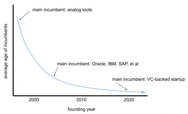 今天成立的软件公司并不是与传统行业竞争,而是与大公司竞争。换个说法,正如之前每一个成熟的行业都会发生的那样,互联网公司的收入将变成一场零和游戏。作为一个推论,软件创业公司的成立年限,与其竞争的大公司成立的年限之间的差距正在缩小。