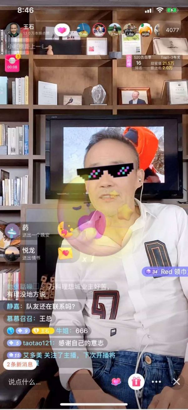 我进入王石在抖音的直播间,他已经开始了半个小时,直播间里只有4000多人,最高峰是两万。