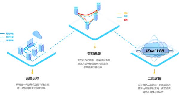 在企业网络环境稳定性方面,爱快通过三种策略保障数据传输质量。首先企业可以通过云端调度宽带资源和路由策略;其次可以通过BGP链路,为组网提供足有传输路径;还可以通过爱快的二次封装技术,规避运营商线路限制策略。