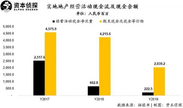 自身造血能力的降低,也导致公司现金储备出现大幅下降。实地地产现金及现金等价物从2017年末的45.8亿元,下降到2019年末的20.4亿元,下降幅度超过25亿元人民币。
