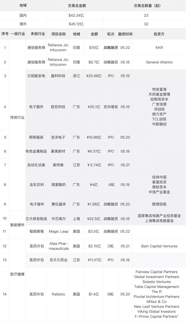 鹰眼投研数据研究表明,本周期内全球大额交易共计87.46亿美元,交易金额环比增加118.27%,大额交易金额流入增幅明显。该周期内大额交易聚焦于智能硬件和通信等领域,私募股权公司KKR已同意向印度电信科技巨头Reliance Jio Infocomm投资15亿美元,这是一个月内,Reliance Jio先获得Facebbook57亿美金的融资;而后又得到银湖资本(Silver Lake)7.49亿美元融资和美国私募股权公司Vista equity15.41亿美元的战略投资;至此Reliance Jio共计获得103.6亿美元的融资。本次KKR将通过此次投资获得Reliance Jio Infocomm2.32%的股份,Reliance Jio的投后估值也达了646.61亿美元。