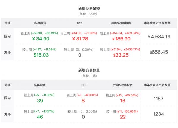 新增交易金额:本周全球投资总金额为93.90亿美元,全球资金流入总额环比增加117.46%。鹰眼投研数据研究表明,本周期国内IPO阶段和并购与战略投资阶段新增交易金额流入均实现大幅增长,海外新增交易金额中并购与战略投资阶段资金流入总金额较上周增加31.94亿美元,环比增加2438.17%,私募融资阶段资金流入总金额较上周减少1.97亿美元,环比下降11.59%。