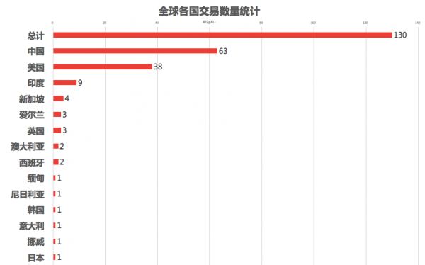 交易数量:该7日交易周期内新增130起交易事件,中国交易数量占全球交易数量的77.69%;美国交易数量占全球总交易数量的29.23%。