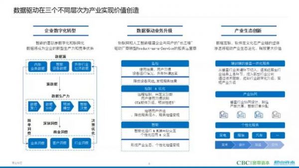 第三个层次:产业生态创新随着企业数字化转型不断深入,我们将看到,某一个产业链的上下游,都可以更好地实现数据互联,信息交互效率的极大提升将带动整个产业链的效率得到极大提升。一些产业的传统生产关系在这样的高效互联下甚至将发生重大转变,我们习以为常的一些传统生产关系、生产模式都可能在新的“互联世界”里进化成全新的形态。