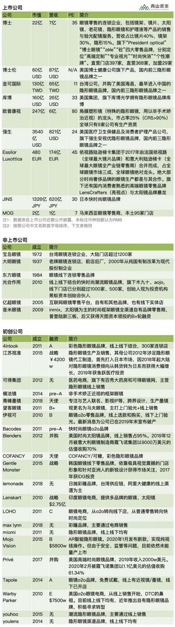 以下是眼镜赛道里的不同类型企业图谱,包括有公开信息的初创企业。