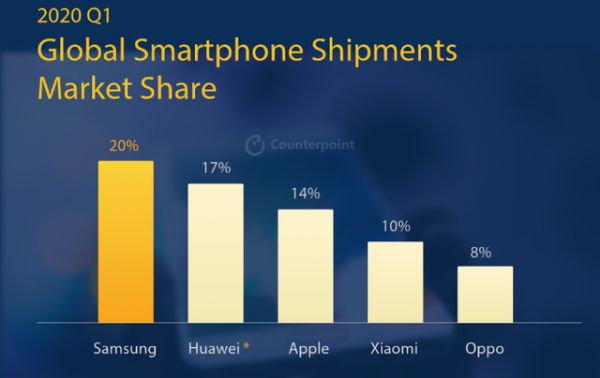 近期,据Counterpoint最新发布的调研报告数据显示,2020年一季度全球销量前五的依次是:三星、华为、苹果、小米、OPPO。其中,华为再次在单季战胜苹果,成为全球智能手机出货量亚军。