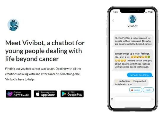 此外医疗聊天机器人领域另有一起非营利组织间进行的合并事件。GRYT Health于2019年10月宣布收购Vivibot,集成其聊天机器人对话界面。Vivibot由非营利组织HopeLab开发的为癌症幸存患者提供康复指导及病友经历交流工具。GRYT Health成立于2016年定位于癌症患者帮助及社群工具。聊天机器人在这里的使用,除了提供帮助信息,也有一定的心理抚慰作用。