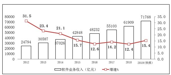 图1 – 2012年至2019年我国软件及IT业务收入增长情况 (数据来源:工信部统计公报)