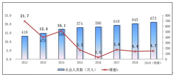 图2 – 2012年至2019年我国软件及IT从业人员数量变化情况 (数据来源:工信部统计公报)