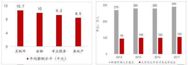 行业规模的扩大刺激了人才需求,同时受IT领域薪酬稳定且持续走高的“加持”,越来越多的求职者瞄准了这一行业。即便如此,人才培养速度还是赶不上行业增长速度,求职者的专业技能水平也不能全然满足用工需求。据公开数据显示,2017年,全国IT行业从业人员新增市场需求增长到了290万人,算上因退休、转行等各类原因造成的人员流失,整个IT行业仍有超过185万人的人才缺口。以软件开发为例,我国软件人才需求以每年递增20%的速度增长,每年新增需求近百万。再考虑到近年兴起的人工智能、大数据、机器学习等新兴细分领域人才需求,据权威预测,未来五年,我国信息化人才总需求量高达1,500万至2,000万人。