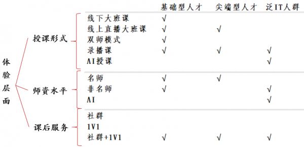 中国用户在教育方面带有很强的本土特点,诸如美国LinkedIn Learning、Udacity原本的知识付费或订阅型教育在中国市场并不叫座。中国用户基于其成长经历更适应班级式学习,尤其相对初级的IT学员存在自我学习能力和自我约束能力相对较低的情况,虽然依靠焦虑感参与了培训,但如果因为自制力导致学习效果不能被满足,焦虑的雪球就会越滚越大。因此班级式、跟踪式的监学督导能让学生更有学习的“归属感”、“仪式感”,毕竟在情感上,志同道合的人一起学习总要比单打独斗更易坚持。具体应该采用何种授课班型,要兼顾用户群体特性,需要公司在成本比例和教学效果上寻找平衡。