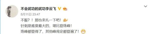 → 李云飞隔空互怼:“不服?!那也来扎一下吧!针刺是难度最大的,堪比登珠峰!珠峰都登得了,其他峰肯定都登遍了!”