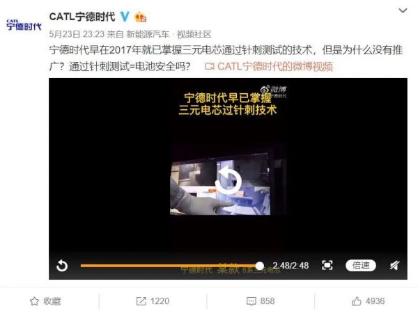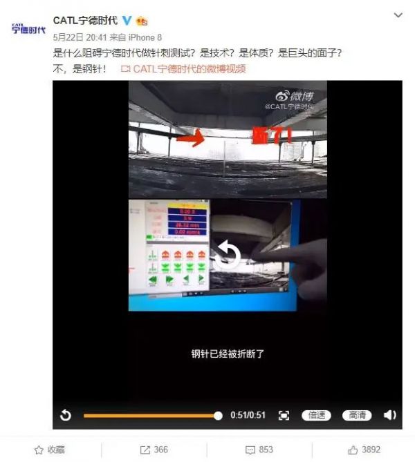 → 宁德时代放出第二段视频,视频中三元锂电池通过了穿刺实验。还表明其早在2017年就掌握了三元锂电池通过穿刺实验的技术。没有推广是因为他们认为穿刺实验≠电池安全(其中有微博网友@小鱼锂电放出了两段宁德时代三元锂电池在经过穿刺实验瞬间着火的视频)