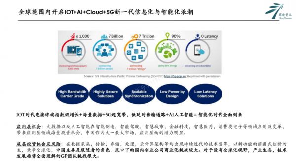 5G意味着更高的传输速率、更低的延迟,可能会带来无人驾驶、VR/AR、远程医疗、工业物联等新应用,也会带来数据感知、传输、存储、处理等底层技术的新变革。这个领域存在很多投资机会。