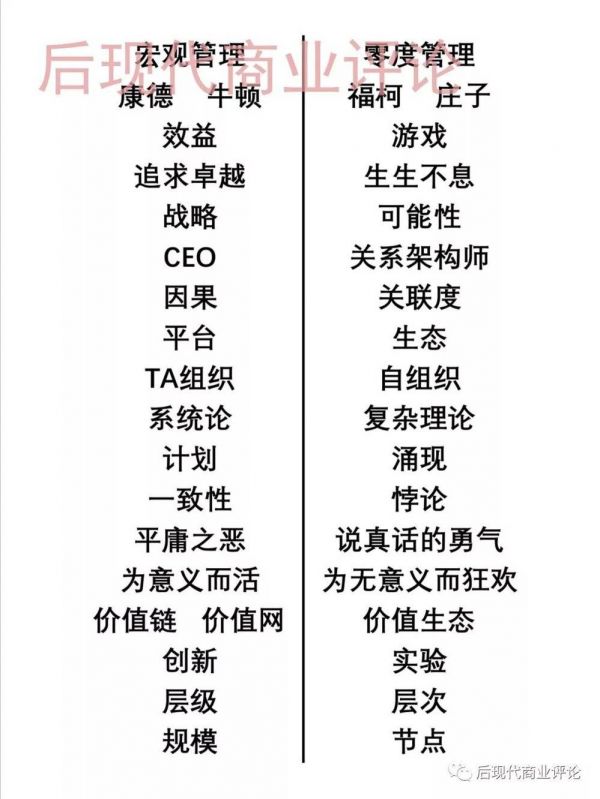 “宏观管理”针对的是系统论,强调的是自上而下的权力机制。“零度管理”针对的是形态并不确定,且始终处于变化中的复杂状态,强调的网络化的权力机制。“零度管理”视野中的主体是关系,组织形式是自组织。