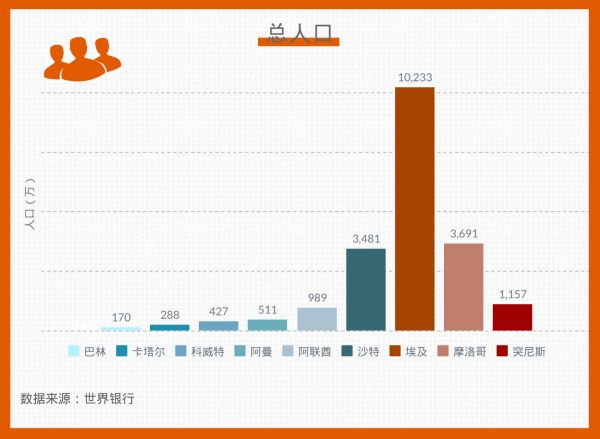 世界银行数据显示,2018年,中东北非人口约为4.5亿。但这片区域中较为富饶的“海湾六国”人口较少,约5800万。沙特是其中最大的国家,人口约3500万。由7个酋长国组成的阿联酋是这一区域第二大经济体,人口接近1000万。北非地区人口较多,其中人口大国埃及就占了整个中东北非地区人口总数的近1/4。