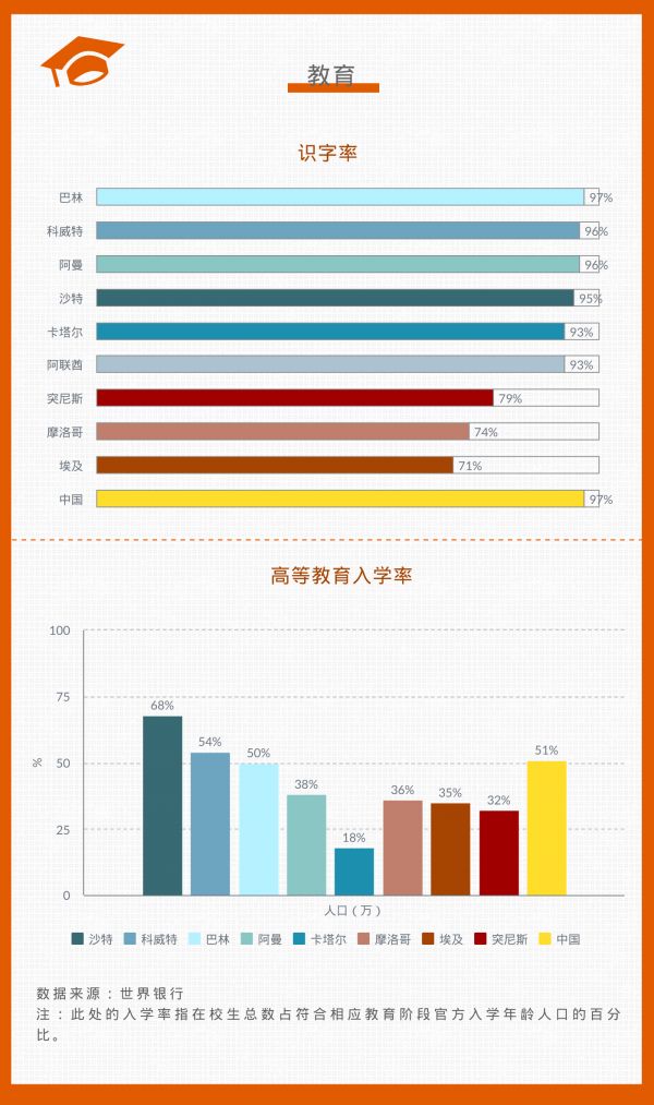另一方面,海湾六国的识字率均在90%以上,而中小学基本覆盖全部适龄入学儿童。在沙特、巴林和科威特,高校入学率都在50%以上。