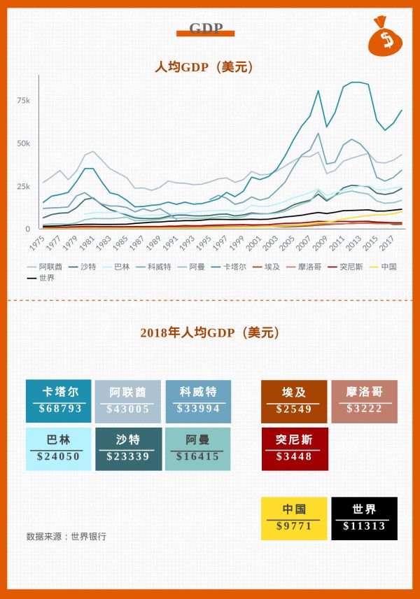 尽管在宗教、语言、文化上相似,北非三国和海湾六国在经济层面却有着巨大差距。世界银行显示,海湾六国都属于高收入国家,2018年六个国家的人均 GDP 都在15000美元以上,卡塔尔的人均 GDP 甚至接近70000美元。与之相对,埃及、摩洛哥和突尼斯三国的人均 GDP 却只有两三千美元,三国都在中低等收入国家之列。