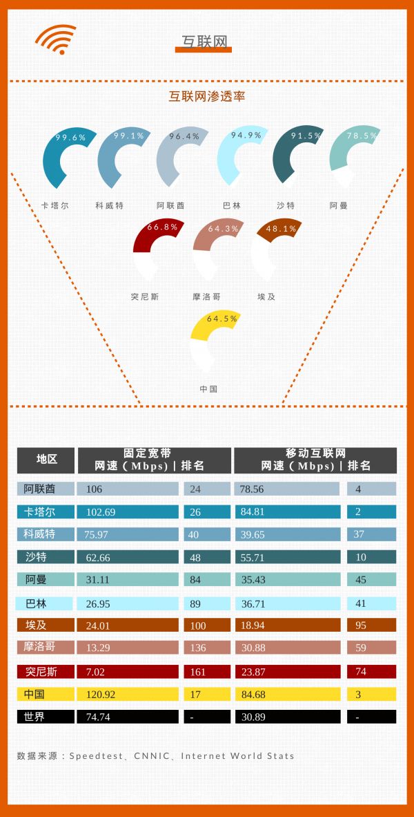 在中东北非地区,海湾六国互联网渗透率达到了非常高的水准。除阿曼以外,海湾六国的互联网渗透率都在90%以上。北非三国中,突尼斯和摩洛哥的互联网渗透率也都在60%以上,与中国差不多。埃及的互联网渗透率接近50%,大致和东南亚的柬埔寨与印尼相当,高于印度。不过,从网速上来看,北非三国的网速都在世界平均水平之下。