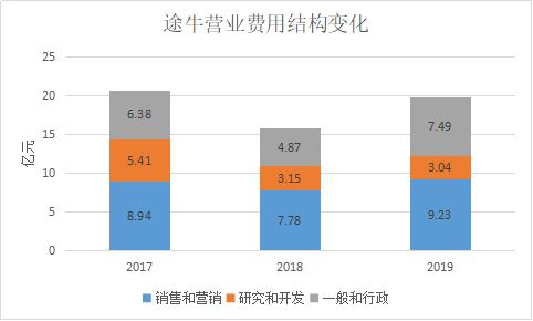 财报显示,2017-2019年,途牛销售和营销费用占总营收的比例分别为40.8%、34.70%和40.50%,居高不下。而在这三年,途牛研发费用占总营收的比例为24.70%、14.10%、13.30%,逐渐下降。