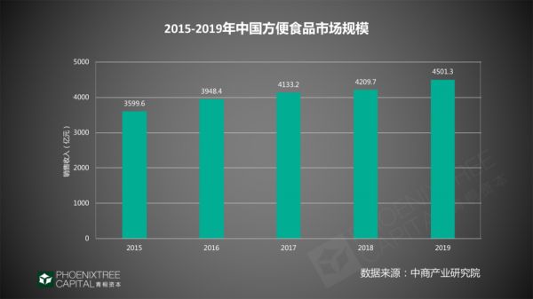 自热食品隶属方便食品赛道,先来看方便食品的总体市场情况。2019年,方便食品市场规模已超4500亿元,年复合增长率5.7%。