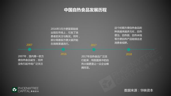 自热食品异军突起,快速跻身方便食品四大品类。纵观自热食品的发展,有两个时间点很重要。2016年,自热食品突破品类,新增方便冒菜、方便火锅两类产品,并在微商渠道流行。2017年,自热食品开始广泛流行,并受到资本关注,小辣龙、挑挑小面获得融资。自热食品的发展逻辑,契合新消费品类的发展规律。