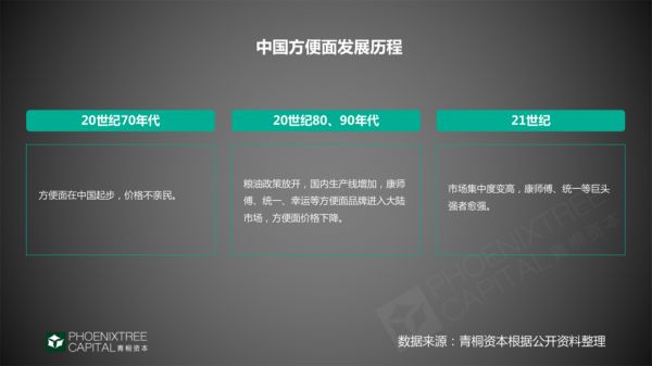 先简要梳理方便面发展逻辑,纵向来看,方便面在中国主要经历了多方品牌入局、价格战、巨头形成的阶段,最终市场集中度变高,康师傅、统一强者愈强。