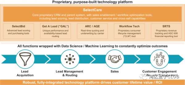 SelectQuote公司开发的专有技术贯穿其整个业务流程,从潜在客户生成、线索评分、产品选择,到最终的客户签约、售后管理和交叉销售等全链路。