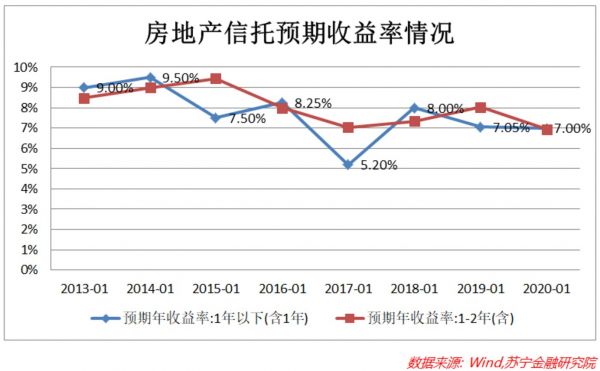 在收益率方面,房地产信托的预期收益率持续走低,从2013年的9%,降到了2020年初的7%。出现这种现象与近年来适度宽松的货币政策、市场利率持续下行有关。