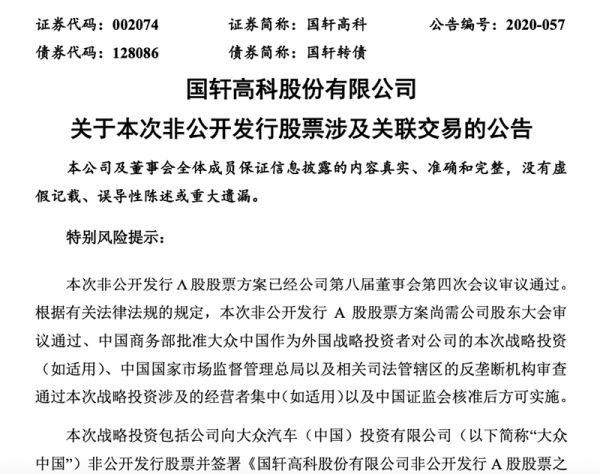 此前,外媒曾报道称,大众集团计划通过折扣私募股权配售方式,收购国轩高科20%的股份。