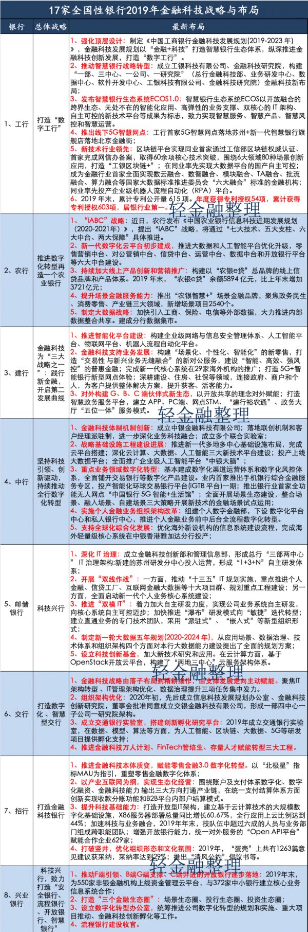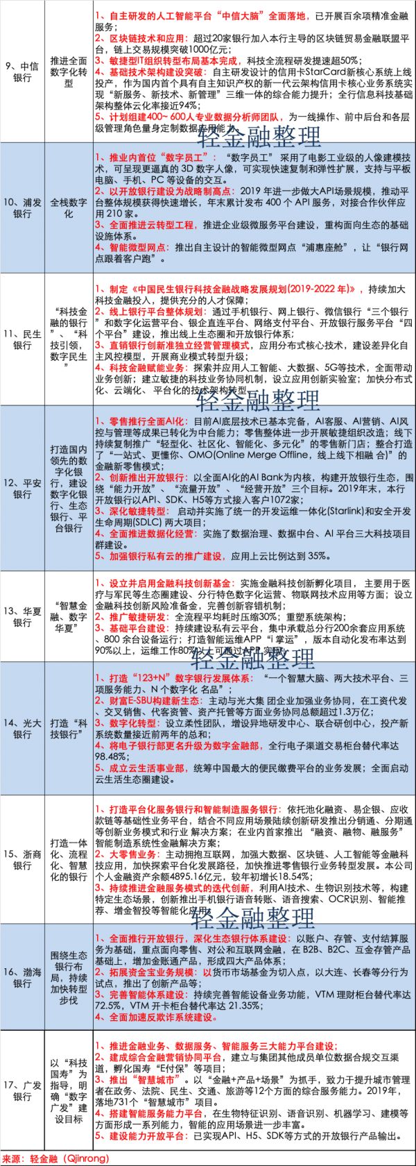 首先,来看本文中最重要的内容,我们整理了17家全国性银行的金融科技最新战略与布局(包括6家国有行、11家股份行)。