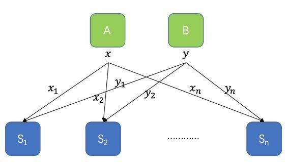 秘密共享体系还具有同态的特性。如下图所示有特征A和B,他们的值被随机分成碎片(X1, X2, …, Xn)和(Y1, Y2, …, Y3),并分配到不同参与节点(S1,S2, …, Sn)中,每个节点的运算结果的加和能等同于原始A与B的加和。同样通过增加其他计算机制,也能满足乘积的效果,这就是秘密共享具备的“同态性”,各参与者可以在不交换任何数据的情况下直接对密码数据求和,乘积。