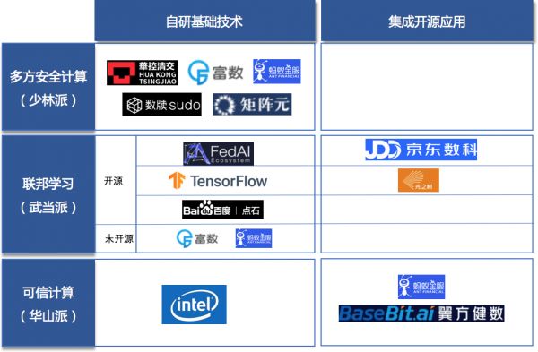 将隐私计算行业里比较有代表性的科技公司按三大门派在自研基础技术和集成开源应用两个维度进行分类,如下: