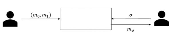 1985年S. Even, O. Goldreich, and A. Lempel [2] 提出了1-out-2 OT, 在此方案中发送者Alice每次发送2个信息和,而接收者Bob每次输入一个选择b, 当协议结束的时候,发送者Alice无法获得关于接收者Bob的任何有价值的信息,而接收者Bob只能获得,对于, 接收者Bob也一无所知。