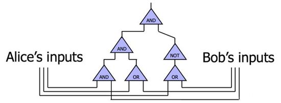 混淆电路(Garbled Circuit)是姚期智教授[4]在80年代提出的安全计算概念。通过布尔电路的观点构造安全函数计算,达到参与者可以针对某个数值来计算答案,而不需要知道他们在计算式中输入的具体数字。