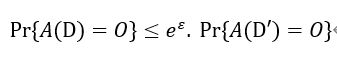 差分隐私中一个关键概念是相邻数据集,假设给定两个数据集D和D’,如果它们有且仅有一条数据不一样,那么这两个数据集可称为相邻数据集。那么如果对于一个随机算法A如果其分别作用于两个相邻数据集得到的两个输出分布式难以区分的,那么这个算法就被认为达到差分隐私的效果。这里的随机算法,是指对于特定输入,该算法的输出不是固定值,而是服从某一分布的算法。下面公式是Dwork的差分隐私定义: