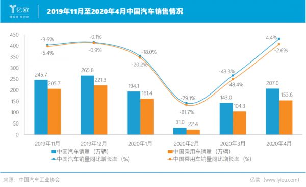 今年2月,为保证经销商行业的正常运转,中国汽车流通协会向中国银保监会、商务部提交了请求相关政策扶持的报告,希望借助国家力量保护汽车流通行业免遭系统性风险。随着行业稳步复工,辅之相关政策,中国汽车市场近期有回暖迹象。据中汽协数据,4月份中国汽车产销量分别同比增长2.3%和4.4%,21个月以来首次实现上涨。