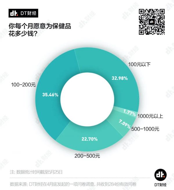 第三,价格空间。从消费数据里可以看出,当前保健用品的主要客群对价格的敏感度仍然比较高,但这并不意味着用户的消费力仍然停留在100元。在我们的调查中,有超过2成读者愿意每月花费200-500元在保健品上。