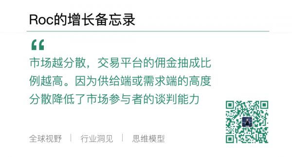 整个市场越分散,交易平台的佣金抽层就会越高。这是因为供给端或者需求端的高度分散降低了市场参与者的谈判能力;