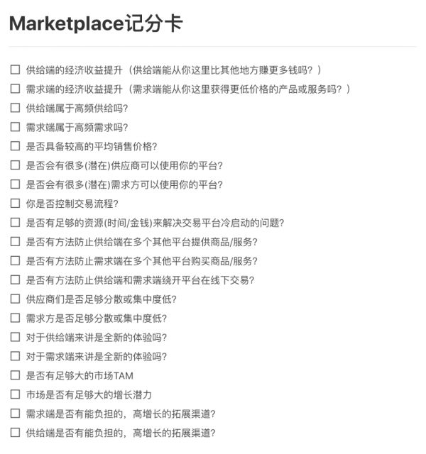 在Uber早期投资人Bill Gurley早期2012的博文《All markets are not created equal: 10 factors to consider when evaluating digital marketplace》中,以及在nfx的Marketplace交易平台计分卡中,已经详尽的将评估交易平台的核心因子一一罗列。