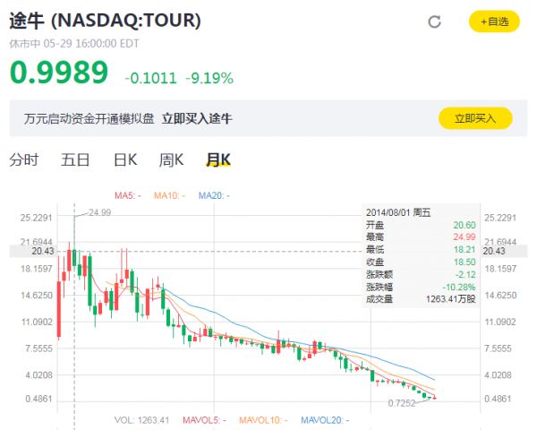 凯撒旅业的半途撤退让途牛的股价一夜跌回解放前。5月29日当天16:00,途牛股价已经跌至0.99美元,市值更是只有1.3亿美元。