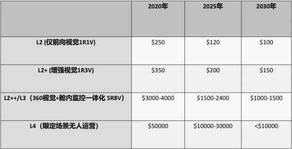 最高端的L4:非常粗略的估计,目前一套系统大概5万美金以上,主要是高端的Lidar和计算平台,未来5-10年传感系统以每年降价30%的步伐,初步估计整套L4系统2025年大概降至1-3万美金,2030年降至1万美金以下。