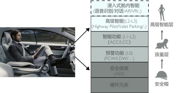 安全帽层:保证车辆和驾驶员性命安全的保底,也可以称为防火墙层,目前主要指紧急刹车制动(AEB)和核心硬件部件的冗余备份。
