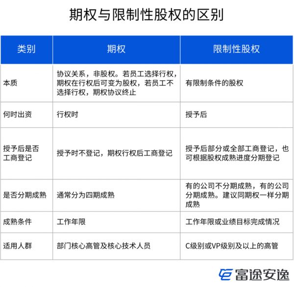 期权与限制性股权差异较多,可针对拟激励对象特点选择适用。实施股权激励前,需先行确定股权激励模式,即定股,公司类型不同、激励对象岗位职级不同,适宜的激励模式不同。互联网公司最常用的激励模式就是期权激励与限制性股权激励,二者区别如下表: